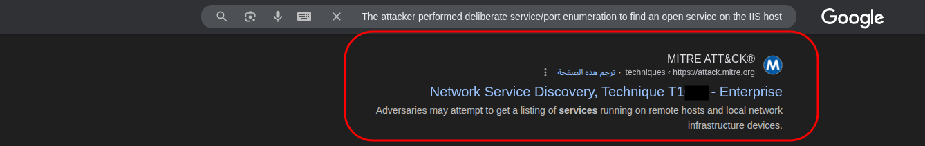 The attacker performed port enumeration to discover an open service on the IIS host.By googling that i get the correct technique ID.