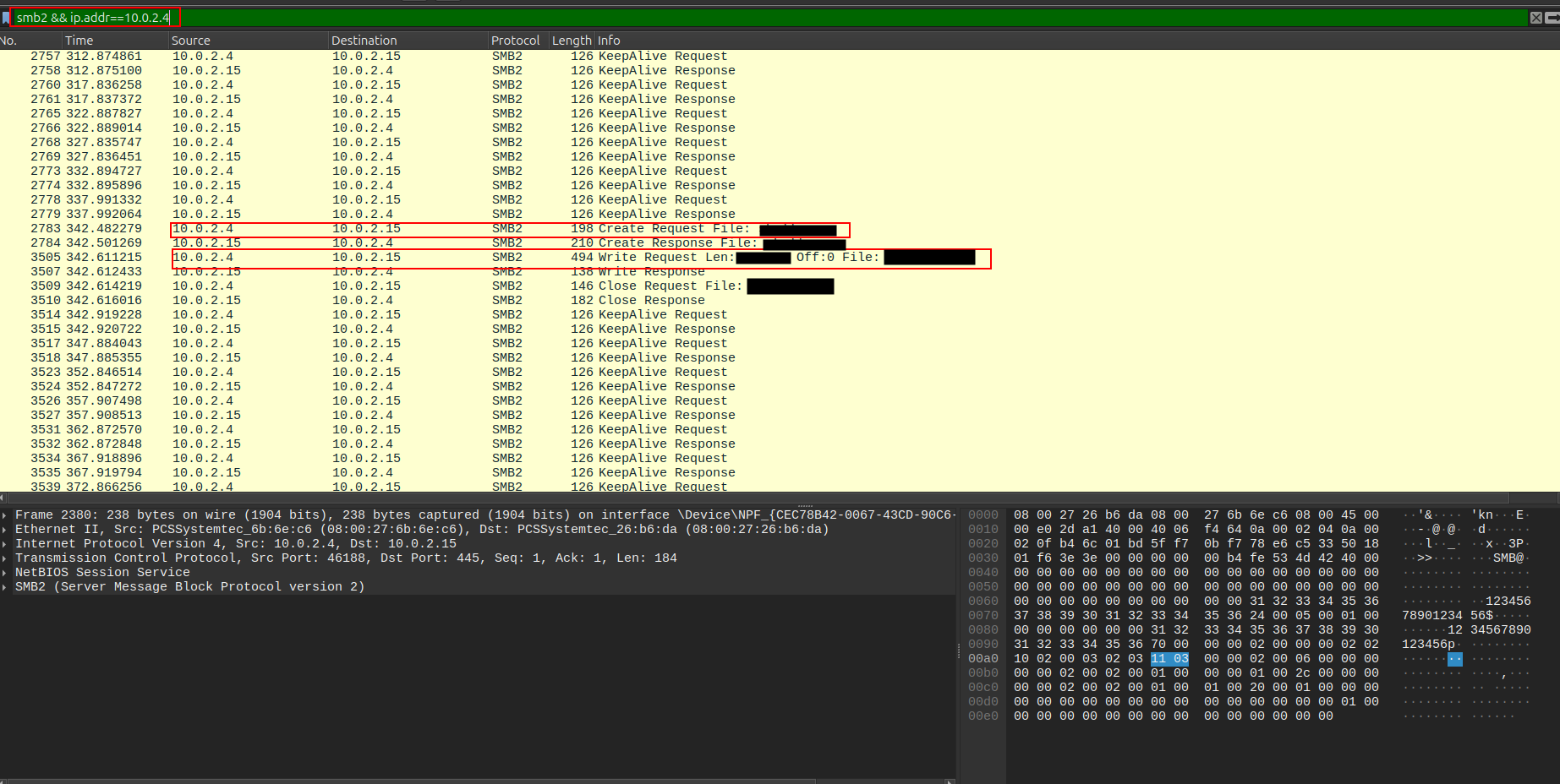 Using the same filter smb2 && ip.addr==10.0.2.4 nd scrolling through the SMB2 stream, I found a Create Request followed by a Write Request specifying both the filename and the payload size