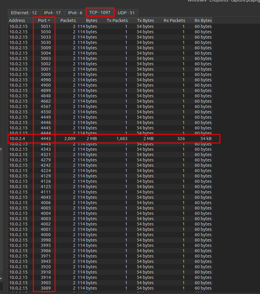 So the IP address generating this traffic is 10.0.2.4 ,and The listener port used for the reverse shell is 4443, which we will use for Q5.