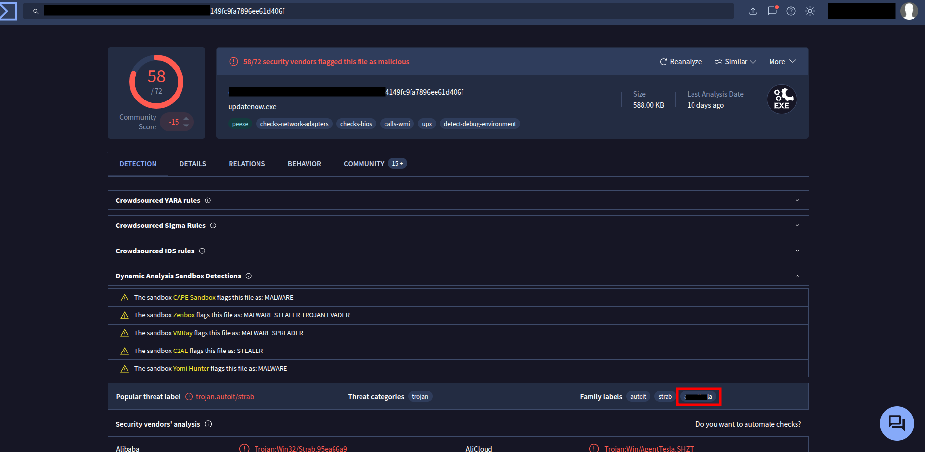 🔹Open-source intel associates that hash with a well-known commodity RAT. To which malware family does the sample belong?