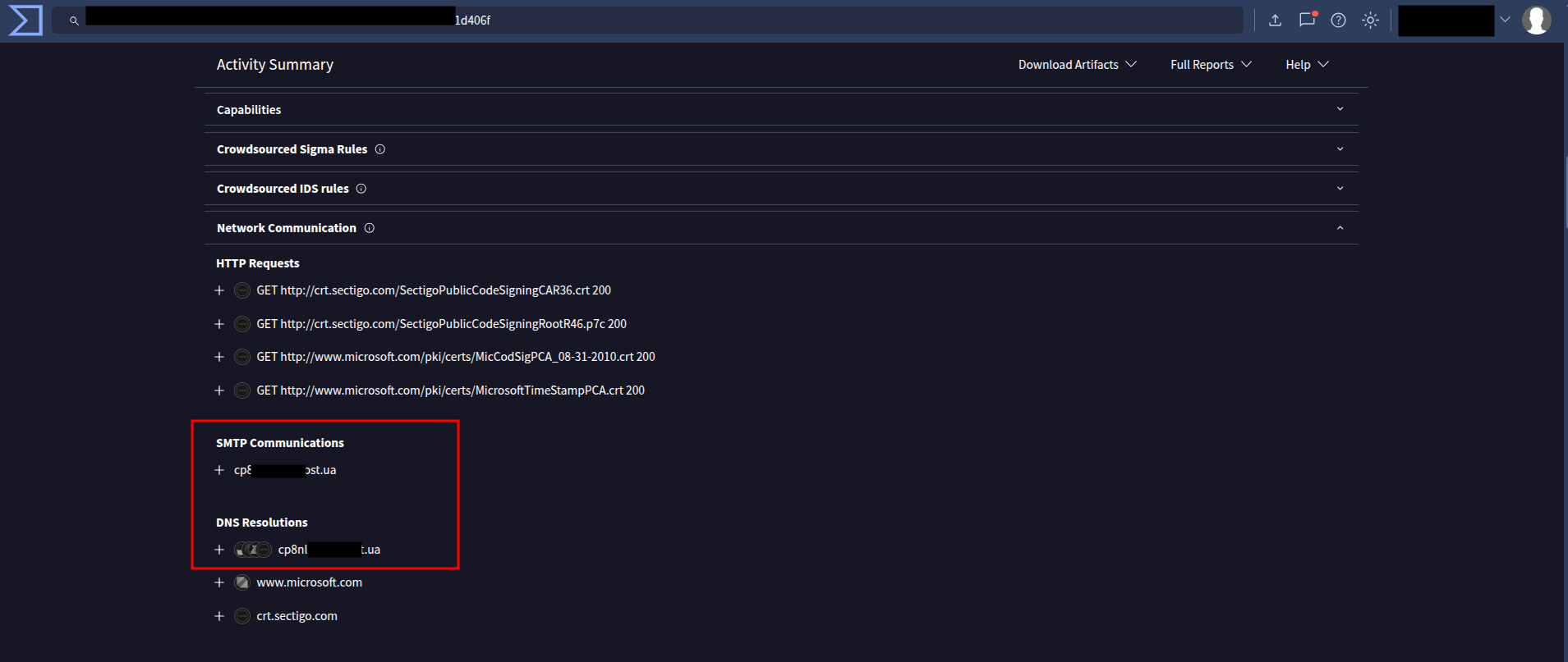 The malware’s behavior report on VirusTotal and the DNS resolution entries reveal the C2 domain.