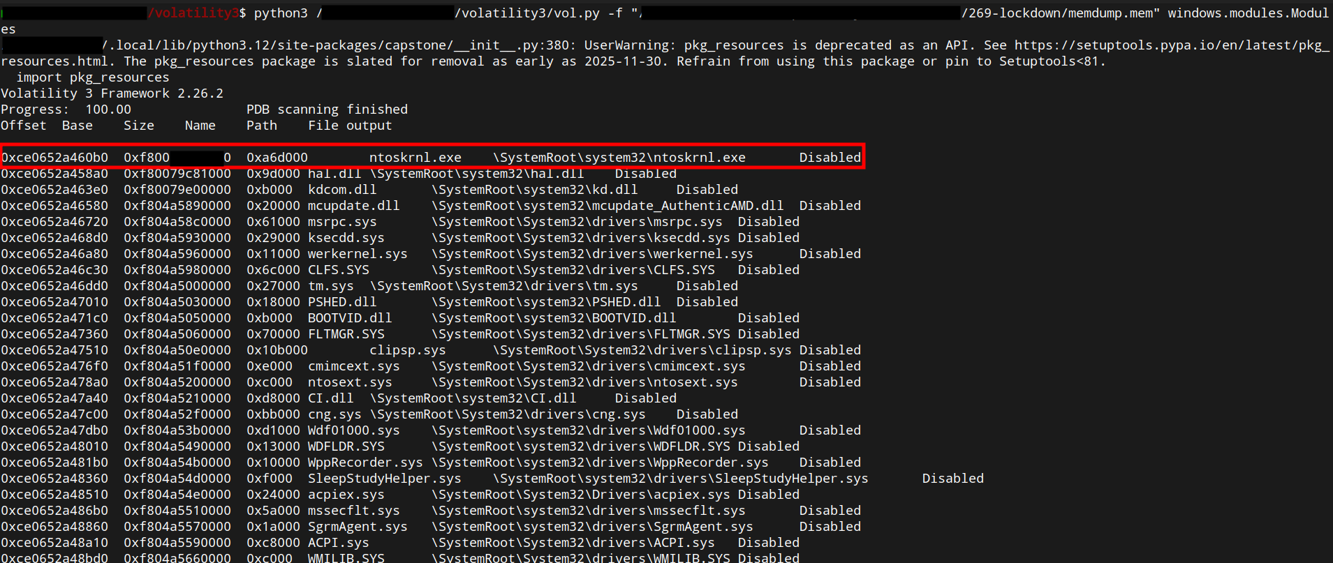 🔹Your memory snapshot captures the system’s kernel in situ, providing vital context for the breach. What is the kernel base address in the dump?