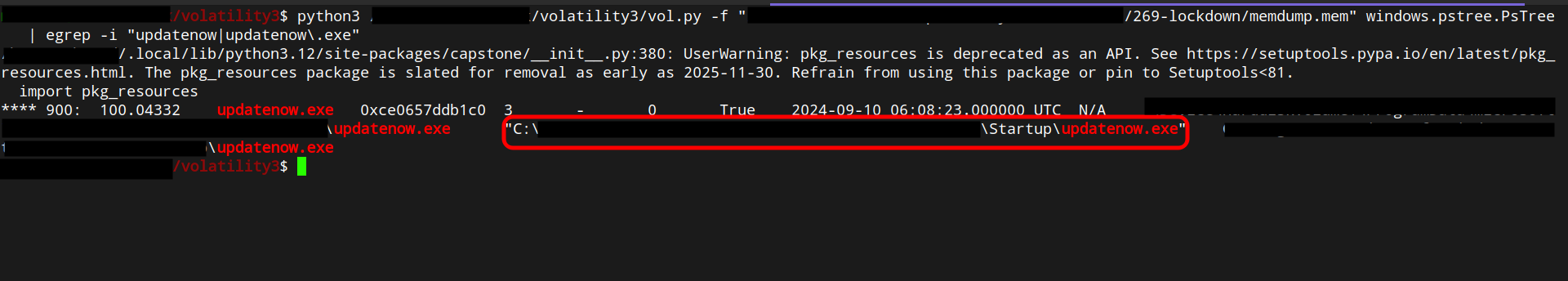 Using Volatility3 with ` windows.pstree.PsTree` and searching for updatenow.exe reveals the implant’s on-disk location.