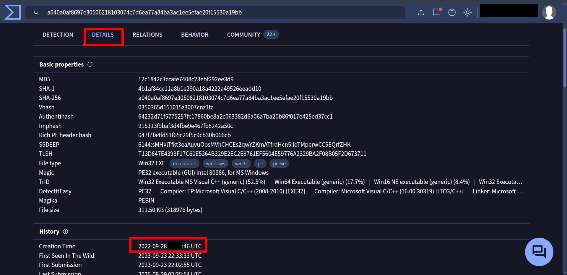 Going to Details section on virustotal you will see the creation time and some other info about this malware’s History