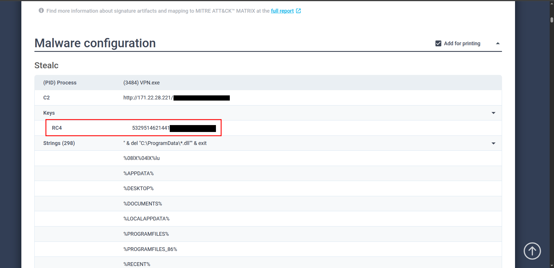 Follwing the report link then to Malware configuration section you will see the keys ,C2 adn strings also the PID