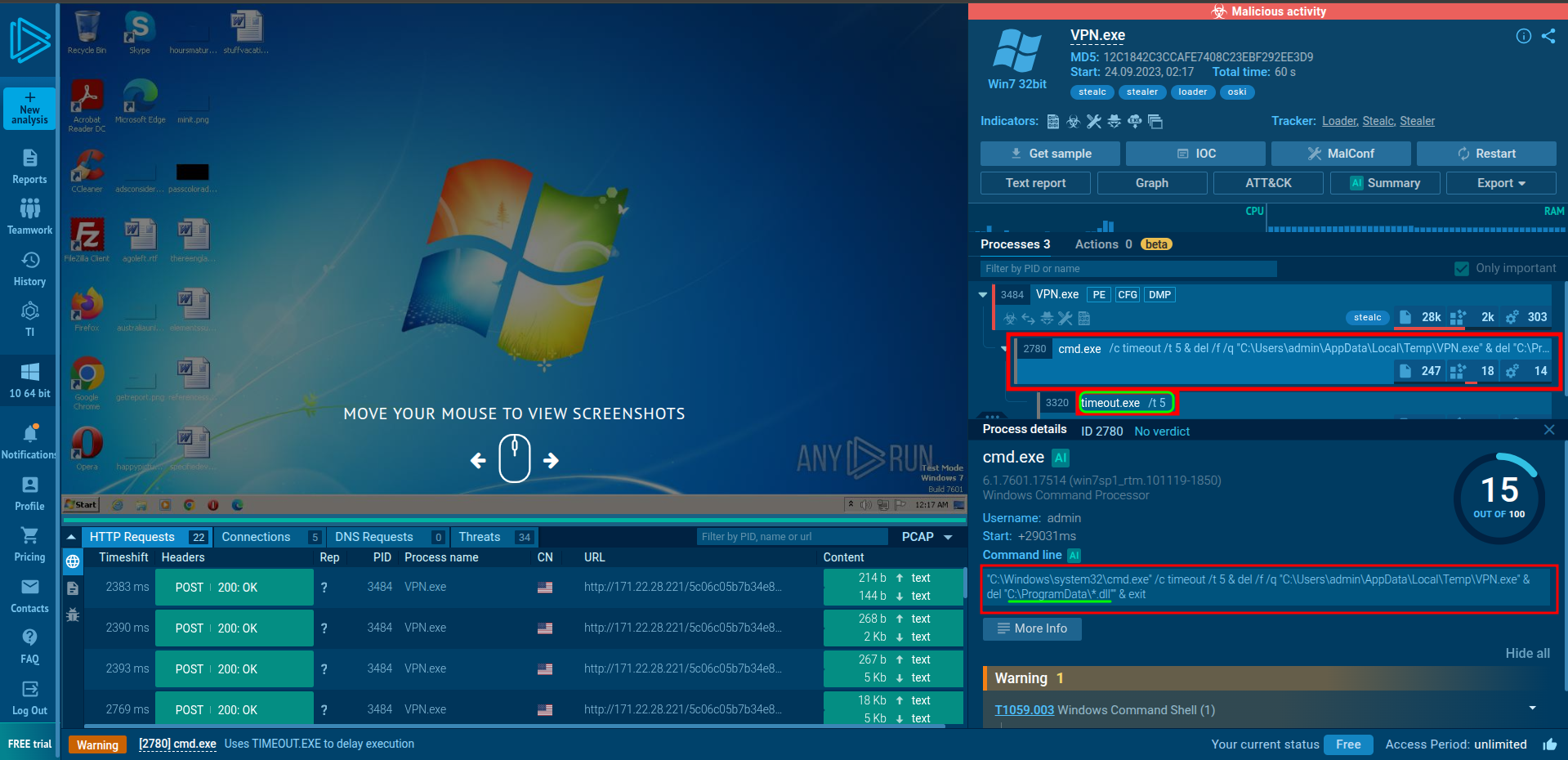 "C:\Windows\system32\cmd.exe" /c timeout /t 5 & del /f /q "C:\Users\admin\AppData\Local\Temp\VPN.exe" & del "C:\ProgramData\*.dll"" & exit